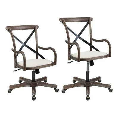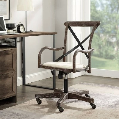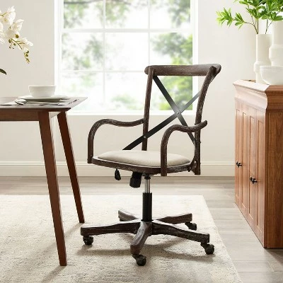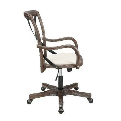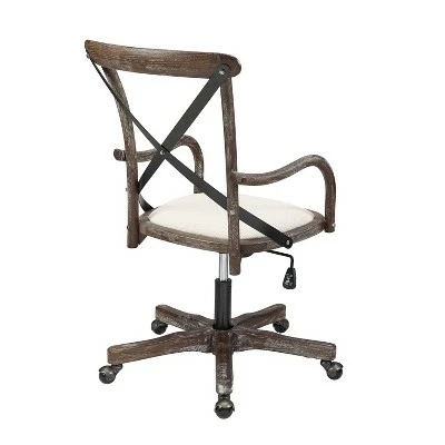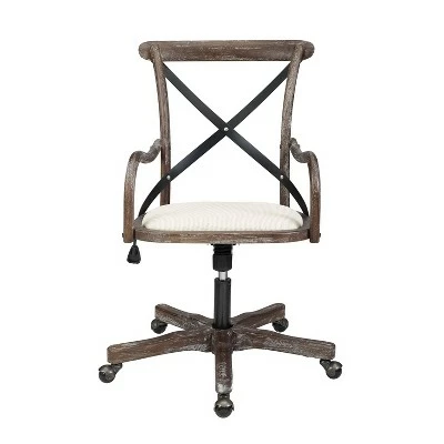 Add stylish seating to your workspace with the Carson Café Office Chair. The gray-washed wood finish is accented by a black metal X back and neutral fabric seat. Antique brass casters make for easy mobility around your office. The adjustable seat height allows the chair to easily work with a variety of desk and table heights. Perfect for any home workspace or office.