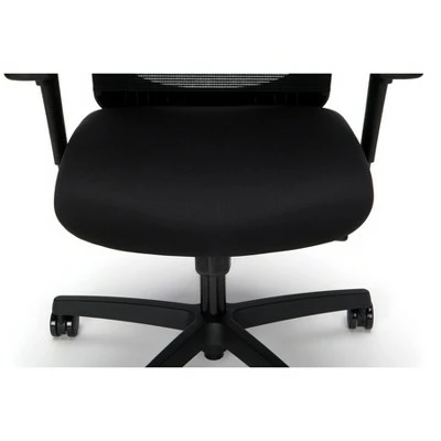 What happens when support and affordability come together? Convergence. The HON Convergence Mesh Back Task Chair with Height-Adjustable Arms, in Black, features a breathable mesh back with a 3″ thick contoured seat cushion that flexes and stretches to make the soft foam even more responsive. The office chair also boasts an intuitive, adjustable lumbar support that provides lasting comfort during long workdays. Height- and width-adjustable arms put the support right where you need it. This task chair has an integrated handle, on the back, that makes it easy to move from office to conference room and back when needed. Ergonomic features such as synchro-tilt, adjustable arms, and seat glide allow you to customize the chair to your needs. The hard casters move effortlessly on any surface and the five-star base with 360-degree swivel allows for a 275 lb weight capacity. The office chair is backed by the HON Limited Lifetime Warranty.