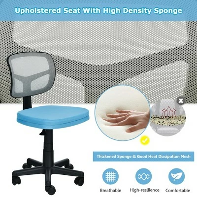 Our office chair is a must-have product for your daily office. Due to the height adjustment function, whether it is for children or office workers, this desk chair can be adjusted to one’s desired height. The mesh executive office chair without armrests not only increases the spaciousness of the seat but also saves space. Filled with the high-resilience sponge, this office chair offers a softer and more comfortable feeling. In the meantime, the detachable cushion cover will leaves you no worry about the cleaning work. The smooth rolling wheels make it easy to move the chair anytime and anywhere. Besides, the five-claw structure can increase the bearing capacity up to 250 lbs and enable a sage sitting experience.. Specification: Color: GreenBlueBlackGray. Material: Sponge, Plastic. Product Dimension: 19.5” x 19.5” x 31”-36” (L x W x H) . Seat Size: 17.5” x 15.5” x 2” (L x W x H) . Net Weight: 12 lbs. Maximum Weight: 250 lbs. Package Includes: . 1 x Office Chair. 1 x Instruction.