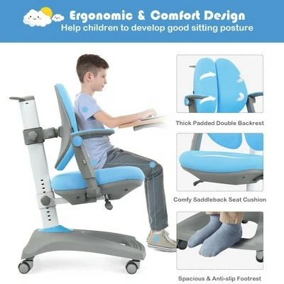 Our ergonomic study desk chair is a perfect gift for your kids! Kids grow so fast that they need a study chair which can grow with them. Our desk chair with adjustable height and seat depth is the perfect choice for growing children. You can raise the seat height from 15.5” to 23” with the rotary knobs. The height of the backrest can also be adjusted from 30.5” to 40” to match your child’s height and posture. Equipped with a double backrest that embraces the contour of the back, this chair can provide all the support that kids need during hours of sitting and studying. And the wheels will automatically lock when there is more than 88 lbs weight applied on the chair seat to make children better focus on their tasks. Specification: Color: Pink/Grey/Blue. Material: Sponge, Nylon, Iron, Fabric. Dimensions: 23” x 18.5” x 32.5” (L x W x H). Seat Size: 18”(L) x 17.5”(W). Backrest Height: 30.5” – 40”. Seat Height: 15.5” – 23”. Adjustable Seat Depth: 3”. Net Weight: 32 lbs. Weight Capacity: 165 lbs. Suitable Age: 3 – 13 Years Old. Package Includes:. 1 x Kids Desk Chair. 1 x Instruction.