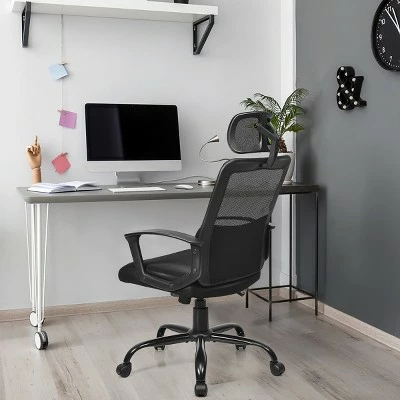 This is our mesh office chair which will offer you extra comfort and new sitting experience! . The ergonomic back design fits your body perfectly . You will sit comfortably and feel relax with soft seat and smooth armrests. Additionally, the chair features a mesh back that allows airflow to keep you cool. The adjustable seat height will match up various heights of tables for your convenient use. Five wheels on the base offer easy and smooth motion on the floor. It’s definitely a perfect addition for office, study and other occasions! . Specification: Color: Black . Material: Mesh, PP, PU, Steel, Sponge . Overall Dimension: 25.5” (L) X 28” (W) X 45.5”-49.5” (H) . Back Size: 20” (L) X 22” (H) . Seat Size: 19.5” (L) X 21” (W) . Net Weight: 27 lbs . Weight Capacity: 265 lbs . Package includes: . 1 X Mesh Office Chair . 1 X Instructions .