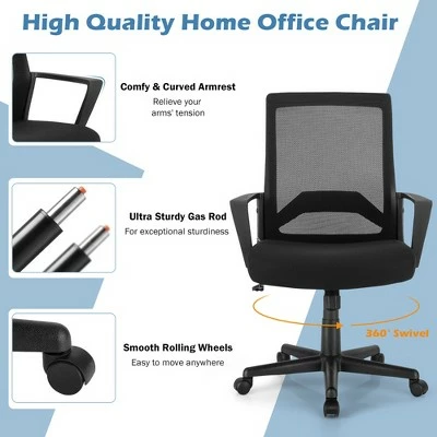 Sit comfortably for long-time work or study with our ergonomic office mesh chair!. The ergonomic backrest perfectly conforms to the curve of body to achieve optimal comfort. And the chair back is made of high elastic mesh, which not only has good air permeability, but also can provide strong support for your back. Thick and soft sponge padded seat cushion provides a comfortable sitting experience. Besides, supported by a robust 5-claw base with a high quality gas rod, this office mesh chair is sturdy enough to hold up to 300 lbs. What’s more, the seat height can be easily adjusted to meet your ideal position. 5 flexible wheels offer fluent and quick motion. This ergonomic executive chair is suitable for all kinds of occasions. It can not only be used in the office, meeting room, study room, but also a good choice for the game room or video room. . Specification: Color: Black. Material: Metal, Plastic, Mesh, Fabric, Sponge. Product Dimension: 26.5” x 26.5” x 39”-42.5”(L x W x H) . Backrest Dimension: 18” x 22”(L x H) . Seat Cushion Dimension: 20” x 19.5”(L x W) . Seat Height: 17”-20.5”. Net Weight: 24 lbs . Weight Capacity: 300 lbs . Package includes: . 1 x Home Office Chair. 1 x Instruction.