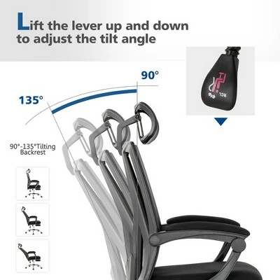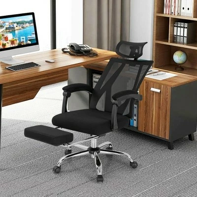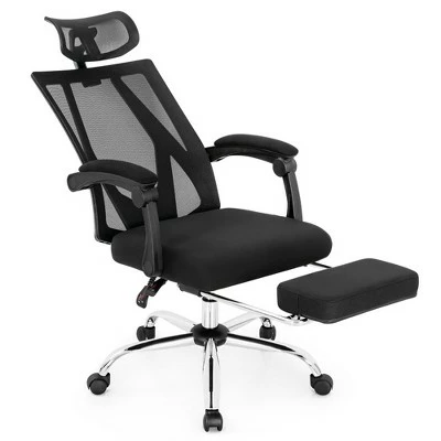 Our recliner office chair is aimed at alleviating spine pressure and improving work efficiency. . The inclination of the backrest(90°-135°) lets you adjust it to suit your different needs. You can adjust the seat to your desired height for a comfortable position. More, there is a retractable footrest, which helps rest your tired feet.The2D headrest with height and angle adjustable design can extremely relax your stiff neck. Plus, mesh backrest keeps air circulation and ergonomic lumbar support supports your waist for a comfortable sitting experience. The wide padded seat lets you stay away from the numbness in the long working day. Heavy-duty base and superior gas lift make it more stable and safe for long-service life. Thanks to the flexible casters and 360°swivel seat, you can easily move around and get higher relaxation. . Specification: Color: Black . Material: PP, Nylon, Metal, Mesh . Overall Dimension: 26.5” x 26.5” x 44”-48” (L x W x H) . Adjustable Seat Height: 17.5”-20.5” . Net Weight: 31.5 lbs . Weight Capacity: 275 lbs. Package Includes: . 1 x Mesh Office Chair . 1 x User Guide .
