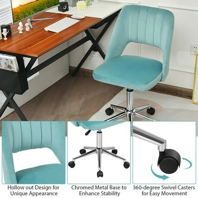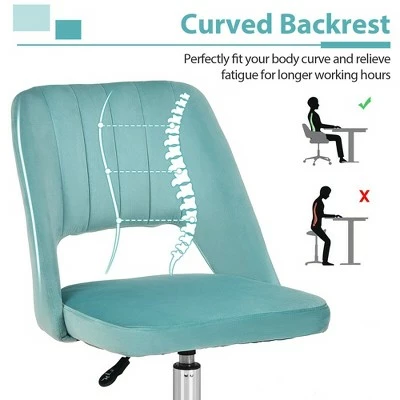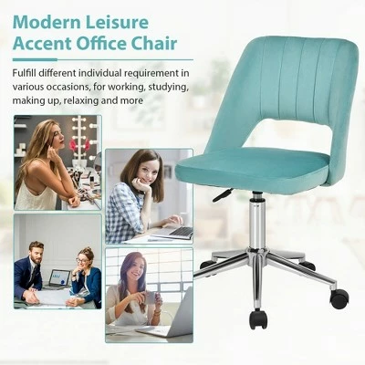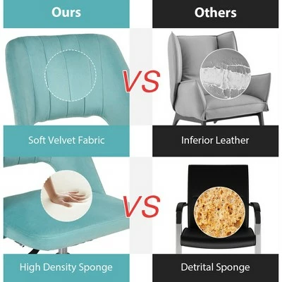If you are looking for a stylish yet practical office chair, ours can well suit your demands. Suitable for working, reading, making-up and more, this leisure chair is an ideal choice for various occasions. Filled with high density sponge inside and covered with soft velvet outside, the office chair enables long hours sitting experience with a sense of comfort. Plus, the seat can be adjusted to your desired height according to actual condition. The ergonomic backrest allows you lean against it to relieve back fatigue. In addition, the smooth rolling casters make for quieter and easier movement to anywhere you like. Reinforced chrome metal base enhances the stability as well as safety to higher level. Specification: Color: Green. Material: Metal, Sponge, Velvet. Overall Dimension: 20.5”(L) x 20.5”(W) x 31.5” – 36”(H). Adjustable Seat Height: 18” – 23”. Net Weight: 14.5 lbs. Weight Capacity: 330 lbs. Package Includes:. 1 x Office Chair. 1 x User Guide.