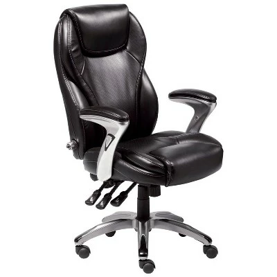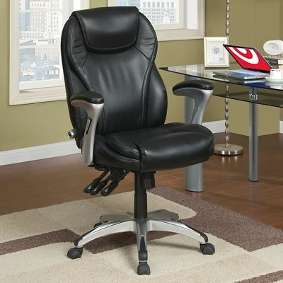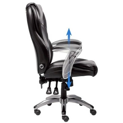 The Serta Executive Office Chair is upholstered in soft and durable Smooth Black eco-friendly bonded leather. This chair features soft pillowed headrest & deep layered body pillows which offer the body a serene and tranquil seating experience. The back and seat feature generously contoured cushions with a layer of supportive memory foam for an amazing comfort experience. The contoured lumbar provides exceptional support for the lower-back. The waterfall seat edge is designed to lessen pressure on the back of the legs, and increase circulation, to reduce fatigue and increase working focus. The comfortable features include an adjustable lumbar, width and height adjustable arms and a multi-function/multi-paddle seat plate mechanism.