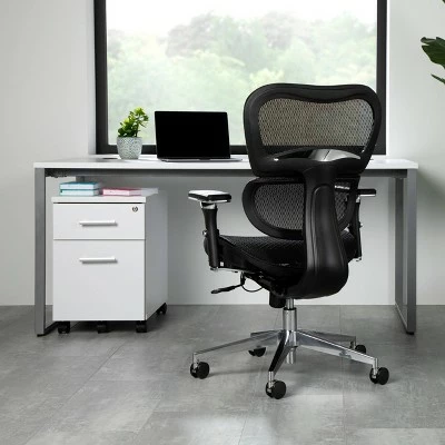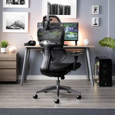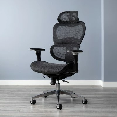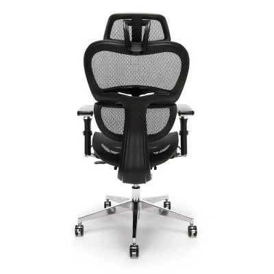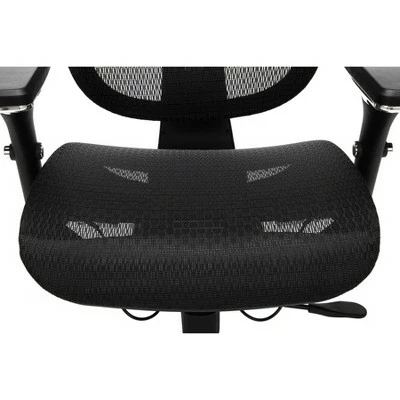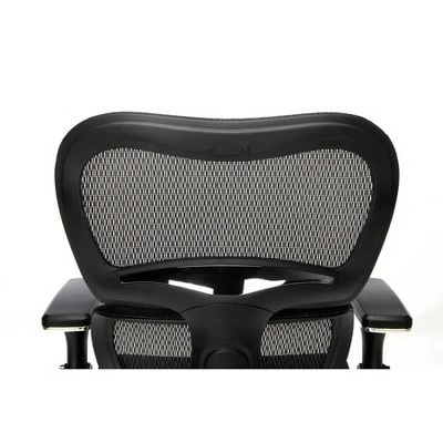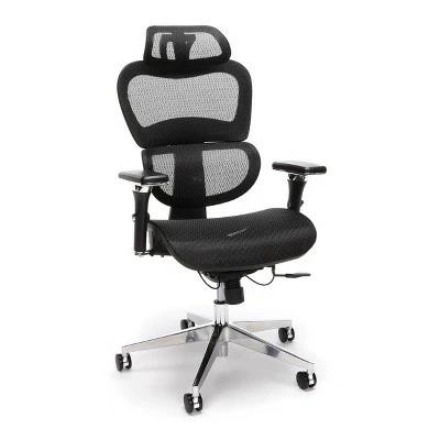 The OFM Ergo Mesh Office Chair, in Black, offers similar ergonomics and functionality as leading ergonomic office chairs at a fraction of the price and a sleek, stylish look that is sure to get attention. The Ergo ventilated design includes a 3 part mesh contoured back and headrest with adjustable lumbar, a mesh seat with depth adjustment, Synchro-Tilt control, and 4D adjustable arms. The 4D adjustment allows for height, depth, width, and pivoting adjustment of the armrests. The Ergo Mesh computer desk chair also features a chrome base with arm and caster accents and mesh fabric for the chair back and seat. This desk chair meets ANSI/BIFMA standards, has a 275 lb recommended weight limit, and is backed by the OFM 10-Year Limited Warranty.