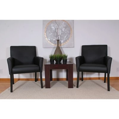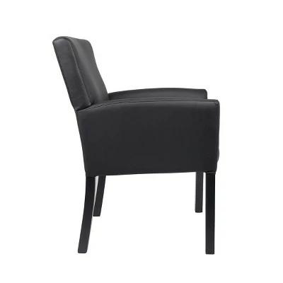This Executive Box Arm Chair is beautifully upholstered in Black Carresoft. The softness of the seat is bolstered by the ergonomic built-in lumbar support that it provides. It features spacious box arm styling and sits on Black wood legs that are both sturdy and stylish. The angular chair features an elegant, contemporary design that can provide your office or reception area with an upscale look. This is the chair for outfitting your office desk or a waiting room with comfort and class.