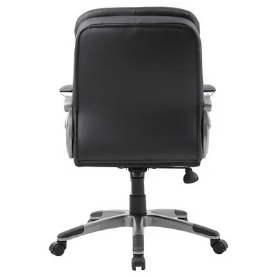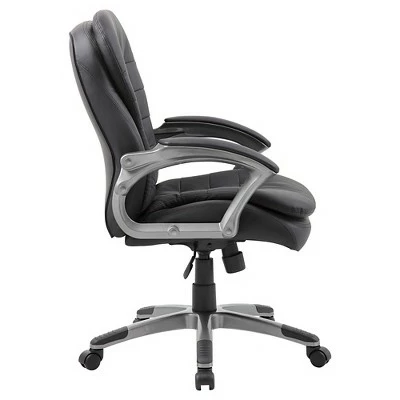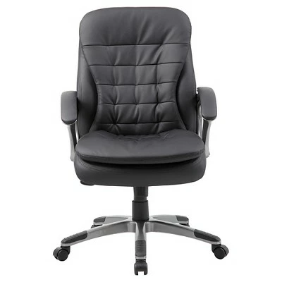 Our mid back executive pillow top chair is a welcome addition to any office environment. It is beautifully upholstered in soft, durable Carressoft and features pillow top cushions for an extra layer of softness. In addition to a pewter finish and padded armrests, it features an ergonomic design complete with adjustable tilt tension control, pneumatic gas loft seat height adjustment, and an upright locking position for optimal personalization. All of this rests atop a large 27” nylon base with five hooded double wheel casters.