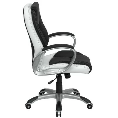 This appealing LeatherSoft chair features eye-catching black and white LeatherSoft upholstery and padded loop arms that sure to please. A mid-back office chair offers support to the mid-to-upper back region. This chair is ideal for anyone who does a great deal of typing throughout the day and needs good back support. The waterfall front seat edge removes pressure from the lower legs and improves circulation. Chair easily swivels 360 degrees to get the maximum use of your workspace without strain. The pneumatic adjustment lever will allow you to easily adjust the seat to your desired height. The titanium nylon base with black caps prevents feet from slipping when resting on chairs base.