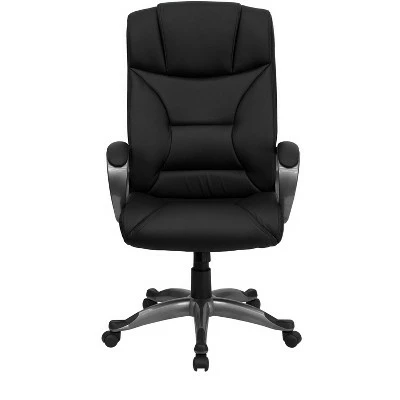 This plush LeatherSoft chair has a very appealing look to show off your modern taste in computer seating. Chair features generous padding on the seat, back and arms to provide comfort throughout the day. Having the support of an ergonomic office chair may help promote good posture and reduce future back problems or pain. High back office chairs have backs extending to the upper back for greater support. The high back design relieves tension in the lower back, preventing long term strain. The waterfall front seat edge removes pressure from the lower legs and improves circulation. Chair easily swivels 360 degrees to get the maximum use of your workspace without strain. The pneumatic adjustment lever will allow you to easily adjust the seat to your desired height. The titanium nylon base with black caps prevents feet from slipping when resting on chairs base.
