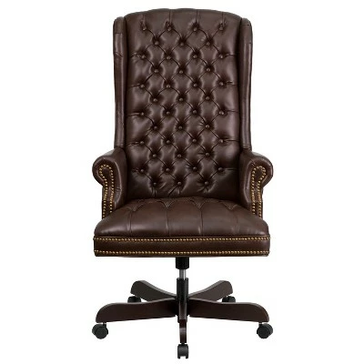 This button tufted executive office chair combines old world craftsmanship with 21st century ergonomic seating principles, giving you a chair that feels as good as it looks. It redefines traditional elegance with its softer edges, subtle styling, and amazing comfort. High back office chairs have backs extending to the upper back for greater support. The high back design relieves tension in the lower back, preventing long term strain. Chair easily swivels 360 degrees to get the maximum use of your workspace without strain. The pneumatic adjustment lever will allow you to easily adjust the seat to your desired height. The rolled arms are adorned with individual brass nail trim. The heavy duty mahogany wood capped base adds to the traditional, elegant styling of this chair.