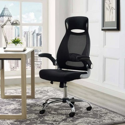Exhibit commands potential with the expedite high back office chair. Expedite’s breathable mesh back is ergonomically designed to assist back and shoulder posture, while the lower portion provides excellent lumbar support. A padded mesh headrest completes the managerial look of this executive office chair, while padded flip-arms add to the versatility. Complete with a densely padded mesh seat, 360-degree swivel, one-touch pneumatic Height adjustment, a tilt-tension control knob, and five hooded dual-wheel nylon casters on a chrome plated aluminum base, glide comfortably over carpeted floors while staying ready for the tasks at hand.