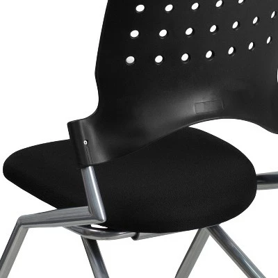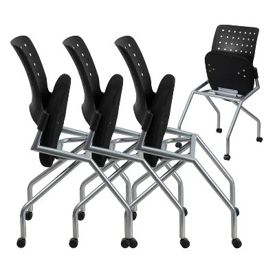 Get comfortable seating when you need it, additional floor space when you don’t. With an updated modern look nesting chairs are ideal for learning, training and collaborative environments. The simple yet stylish design is comfortable enough for conference rooms, reception and hospitality areas and visitor seating. The flexible, perforated back provides relaxation and enhanced circulation while rolling casters let you move and arrange chairs quickly. The curved back conforms to the user’s back for exceptional support. The contoured padded seat dissipates pressure points for greater comfort. Seats easily flip-up, then roll chairs to nest together. Additional Features: Silver Powder Coated Frame, Dual Wheel Casters, Made In Taiwan, TAA Compliant