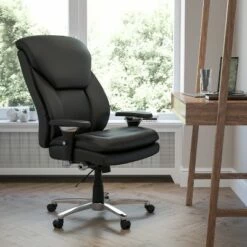 This Big & Tall Executive Office Chair is an ideal chair for larger and taller professionals who spend long hours sitting behind a desk. An extended upper back with integrated headrest and lumbar knob reinforces healthy posture. The 25″ wide swivel seat is double padded with 4″ of foam. Raise or lower the seat using the pneumatic height adjustment lever for a custom fit. Generously padded loop arms reduce pressure on the shoulders and neck providing additional comfort. Turn the tilt tension adjustment knob to increase or decrease the amount of force needed to rock or recline and lock the seat in place with the tilt lock mechanism. This sturdy chair has a heavy duty chrome base, smooth rolling dual wheel casters and a 400 pound weight capacity. Whether you’re buying chairs for a 911 dispatch office, call center, or control room, this 24/7 intensive use office chair is the right chair for the job. Additional Features: 4″ Thick Padded Seat with CAL 117 Fire Retardant Foam, 22″ Wide Swivel Seat, Pneumatic Seat Height Adjustment, Height Adjustable Padded Arms, Heavy Duty Chrome Base, Dual Wheel Casters