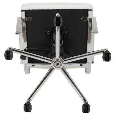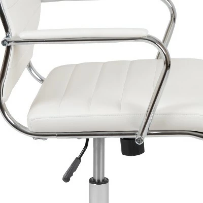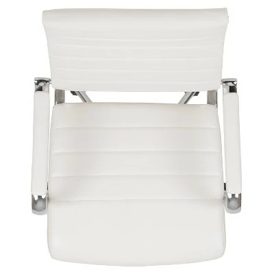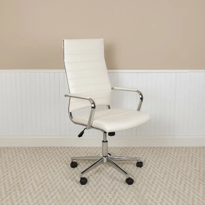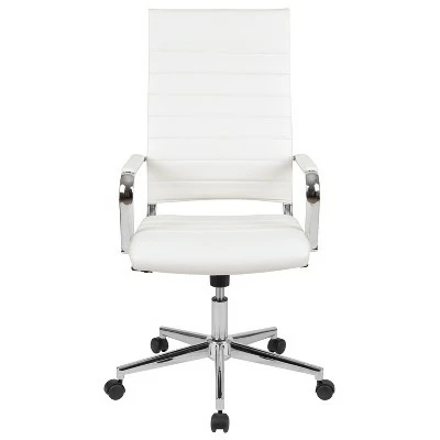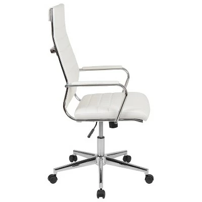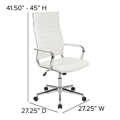 Sleek and modern describe this executive swivel office chair that will satisfy any office. You’ll fall into comfort with the ribbed back desk chair backed by curved lumbar support. An integrated back bar provides a convenient position to hang garments such as coats and jackets. See the distinction light improvements will accomplish for your office with a neutral coat of paint, bright LED lighting, decorative art pieces and this ribbed office chair. Take the pressure off your shoulders and neck by resting your arms on the integrated padded arms that are framed by a glossy chrome finish. Adjust the chair to your desired height by utilizing the lever underneath the seat that also locks the chair in an upright position. When you want to lean back pull the lever out and use the knob to adjust the force that’ll be required to recline. Lessen pressure from your lower legs with the waterfall seat edge which improves circulation. Redesign your hotel business center, meeting room or home office with this high back desk chair to carry your space into the new century. Coordinate your entire office with our armless and mid-back versions. Additional Features: Tilt Lock Mechanism rocks/tilts the chair and locks in an upright position, Tilt Tension Adjustment Knob adjusts the chair’s backward tilt resistance, Pneumatic Seat Height Adjustment, 5-Star Chrome Base with Dual-Wheel Casters, LeatherSoft is leather and polyurethane for added Softness and Durability