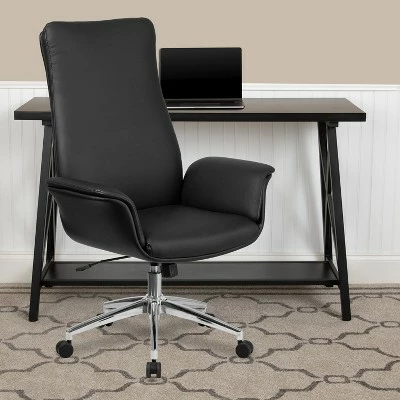 This attractively styled chair features a clean appearance with flared arms. High back office chairs have backs extending to the upper back for greater support. Turn the tilt tension adjustment knob to increase or decrease the amount of force needed to rock or recline. Lock the seat in place with the tilt lock mechanism. Chair easily swivels 360 degrees to get the maximum use of your workspace without strain. The pneumatic adjustment lever will allow you to easily adjust the seat to your desired height. The chrome base adds a stylish look to complement a contemporary office space. Additional Features: Tilt Tension Adjustment Knob adjusts the chair’s backward tilt resistance, CA117 Fire Retardant Foam, Swivel Seat, Pneumatic Seat Height Adjustment, Padded Flared Arms, Heavy Duty Chrome Base, Dual Wheel Casters, LeatherSoft is leather and polyurethane for added Softness and Durability.