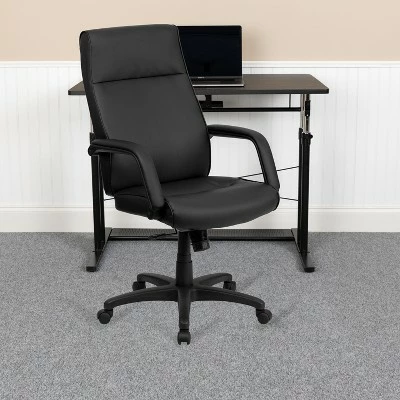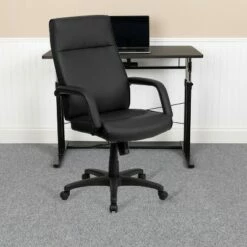 Feel the difference immediately in this executive office chair that features memory foam padding! The plush padding provides instant comfort to help you get through your work day. Finding a comfortable chair is essential when sitting for long periods at a time. Having the support of an ergonomic office chair may help promote good posture and reduce future back problems or pain. High back office chairs have backs extending to the upper back for greater support. The high back design relieves tension in the lower back, preventing long term strain. The waterfall front seat edge removes pressure from the lower legs and improves circulation. Chair easily swivels 360 degrees to get the maximum use of your workspace without strain. The pneumatic adjustment lever will allow you to easily adjust the seat to your desired height. Additional Features: Tilt Lock Mechanism rocks/tilts the chair and locks in an upright position, Tilt Tension Adjustment Knob adjusts the chair’s backward tilt resistance, Waterfall Seat reduces pressure on your legs, Swivel Seat, Pneumatic Seat Height Adjustment, Padded Arms, Heavy Duty Nylon Base, Dual Wheel Casters, LeatherSoft is leather and polyurethane for added Softness and Durability