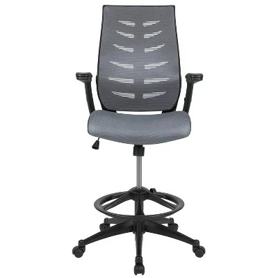 Make your daily tasks at work more pleasant with a high office chair designed especially for your high desk table needs. This tall task chair is ideal at sit-to-stand desks, standing desks, bar height tables and drafting tables. This mesh back drafting chair will make your receptionist’s desk look professional as visitor’s are being greeted. Enjoy the comforts of an ergonomic chair in a taller frame to meet the needs of students and professionals working at above average desk heights. No more miserable summer days at work when you have a mesh back office chair that’ll keep airflow circulating. The curved high back cradles you while offering built-in lumbar support. Designed with your comfort in mind, this drafting stool has invaluable features: – 360 degree swivel seat with mesh covered molded foam – – Pressure relieving waterfall edge – – Height adjustable flip-up arms relieve pressure off your shoulders and neck – – Tilt lock mechanism with variable tension control – – Height adjustable foot ring – – Dual wheel casters to roll across all flooring with ease – Draft chairs are essential for any profession where work surfaces are above standard height, such as lab technicians, architects, graphic artists, or any other creative assignment. They can also make a great chair for any job requiring employees to be at eye contact level with customers, such as receptionists or cashiers. Complete all tasks on this stylish draft chair that’ll keep you cool and comfortable throughout your workday. Additional Features: Padded Upholstered Seat with CAL 117 Fire Retardant Foam, Waterfall Seat reduces pressure on your legs, Pneumatic Seat Height Adjustment, Height Adjustable Nylon Foot Ring, 5-Star Nylon Base with Dual-Wheel Casters