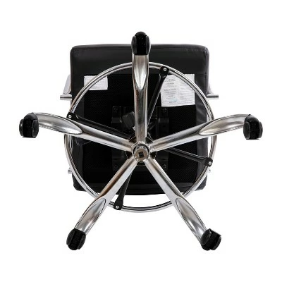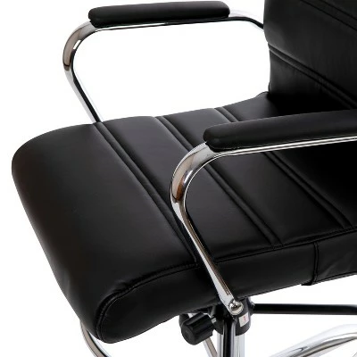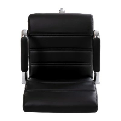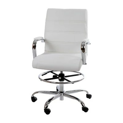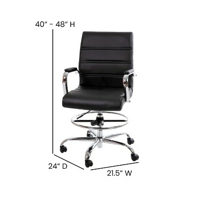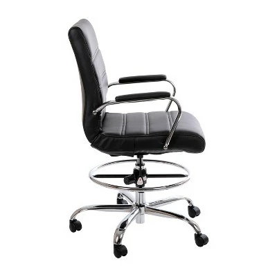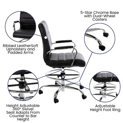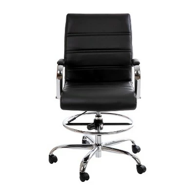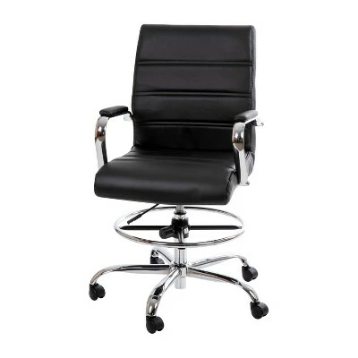 Be comfortable and stylish whether you’re working at your desk or higher surfaces with this height adjustable drafting chair. Covered in soft and durable black LeatherSoft upholstery with ribbed stitching, this modern drafting chair brings subtle sophistication to any area. The padded arms provide tension relief for your neck and shoulders to ease strain and help maintain productivity. Working long hours can be stressful on the mind and body so comfortable seating is a must. The contoured mid-back design provides built-in lumbar support while the height adjustable foot ring and waterfall seat will ease pressure on your legs no matter your seat height. Adjust the seat from counter to bar height with the pneumatic lever under the seat and reach any work surface with the 360° swivel. The chrome column atop a 5-star chrome base with dual-wheel casters will provide stable seating and smooth movement to get you where you need to go. Be ready to work in 30 minutes or less with the included step-by-step illustrated instructions. Wipe down your new drafting chair with a damp cloth to keep it looking new. Additional Features: 5-Star Metal Base with Dual-Wheel Casters for effortless mobility, Clean with Damp Cloth to retain a new look, Assembles in 30 minutes or less with illustrated instructions and included tools, On-trend drafting chair ideal for desk use and above average work surfaces such as hostess stations and drafting tables