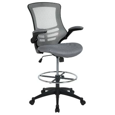 Whether you work from home or go into the office you will be comfortable with the Mid-Back Black Mesh Ergonomic Drafting Chair with LeatherSoft Seat, Adjustable Foot Ring and Flip-Up Arms. This tall task chair is the perfect height for sit-to-stand desks, standing desks, bar height tables and drafting tables. Enjoy the comforts of an ergonomic chair in a taller frame to meet the needs of students and professionals working at above average desk heights. No more miserable summer days at work when you have a mesh back office chair that will keep airflow circulating. The curved back cradles you while offering built-in lumbar support. Designed with your comfort in mind, this drafting stool has invaluable features: 360 degree swivel seat ~ pressure relieving waterfall edge ~ flip-up arms when you want an armless design ~ tilt lock mechanism with variable tension control ~ height adjustable foot ring and dual wheel casters to roll across all flooring with ease. Draft chairs are essential for any profession where work surfaces are above standard height, such as lab technicians, architects, graphic artists, or any other creative assignment. They can also make a great chair for any job requiring employees to be at eye contact level with customers, such as receptionists or cashiers. Complete all tasks on this stylish draft chair that’ll keep you cool and comfortable throughout your workday. Additional Features: Waterfall Seat reduces pressure on your legs, Pneumatic Seat Height Adjustment, 5-Star Heavy Duty Nylon Base with Dual-Wheel Casters, Height Adjustable 20″ Round Chrome Foot Ring Promotes Good Posture, Ideal for extended sedentary professions such as lab techs, architects, bank tellers, administrative personnel