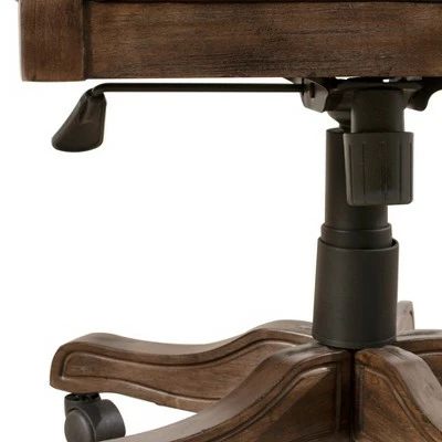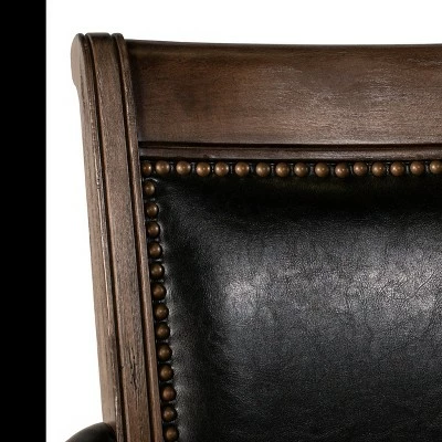 Revisit the grandeur of the classical era with the Freeport Caster Chair from Hillsdale Furniture. Gently sloping backs and ornate, carved arm rests distinguish this adjustable-height, 360-degree swivel chair; genuine black leather adds to the grand sophistication. In a weathered walnut finish, this adjustable height chair gives off a subtle, handsome appearance. Whether in your kitchen, game room or den, the Freeport Caster Chair will make a lasting impression on your guests. Assembly required.
