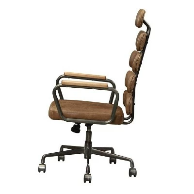 - Constructed sturdily from wood, metal and is upholstered with brown faux leather and is accented with black finish.