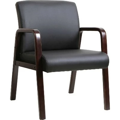 - Guest chair offers ideal guest seating with thick cushions, a wood frame and black bonded leather upholstery. Chair also features fixed arm rests to add to your comfort.