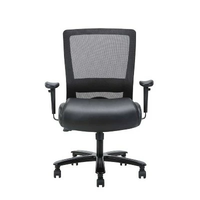 Our heavy duty mesh chair makes the perfect companion to any office, board room, or study. Its 400 pound weight capacity ensures a comfortable sitting experience with a broad range of body types. It’s seat is elegantly upholstered in black LeatherPlus and features a soft pillow top cushions for added comfort. The mesh back allows the cushion to breath with no moisture build up. It has height adjustable arms. The chair features pneumatic gas lift seat height adjustment, a heavy duty spring tilt mechanism, and tilt tension control. All of this sits atop a large 29” steel base with five large heavy duty casters.