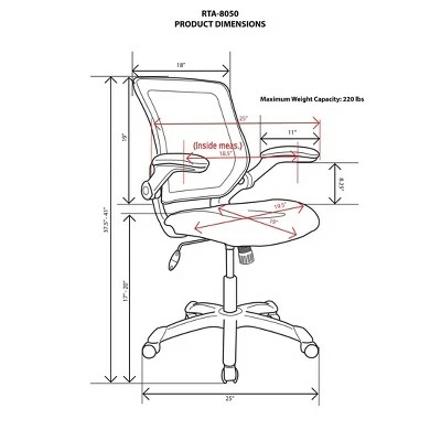 The Techni Mobili Task Chair is a fun, lightweight office chair that features breathable mesh back support, pneumatic seat height adjustment with adjustable tilt tension control, fabric mesh seat cushion, flip-up armrests, durable nylon base with non-marking casters and fits people up to 220lbs. It is Ready and easy to assemble. Color: Black