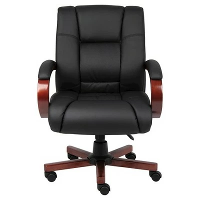 Our mid back executive chair features a beautiful classic wood design and is elegantly upholstered in breathable Caressoft upholstery. It features plush Dacron-filled top cushions with perforated centers, cherry finished wood, and a heavy duty dual paddle spring tilt mechanism with infinite lock. There’s also an adjustable tilt tension control and pneumatic gas lift seat height adjustment. All of this rests atop a sturdy 27” nylon base with five hooded double wheel casters for optimal mobility.