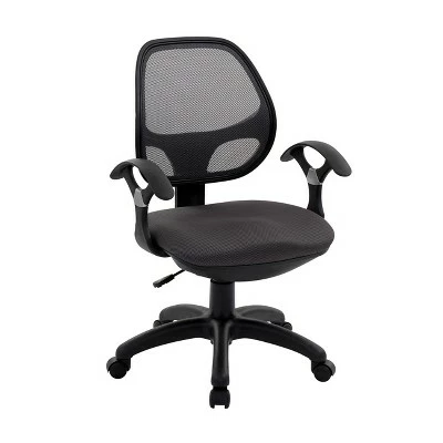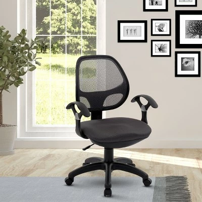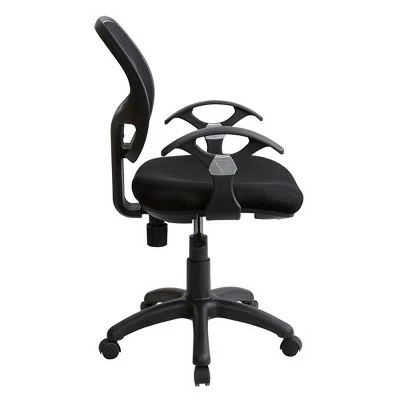 The Techni Mobili Midback Mesh Task Chair provides breathable mesh back support, a contoured fabric mesh seat cushion and contoured armrests with a sleek, contemporary design. The pneumatic height adjustment lever provides a 4.5 inch seat height adjustment range and the reclining back has a tension control knob. Dual wheel non-marking casters and a 5-star nylon base provide durable and stable mobility. Chair holds up to 150lbs. Color: Black.