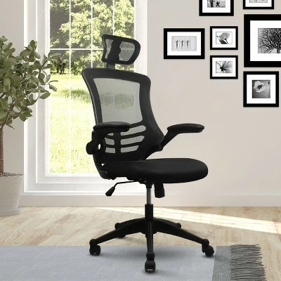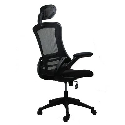 The Techni Mobili Executive High Back Mesh Chairs has a sleek, contemporary design and features breathable open mesh back support, a contoured mesh fabric seat cushion, height-adjustable headrest, padded flip-up armrests. The reclining back has a locking lever and a tension control knob. Includes dual non-marking casters and 5-star heavy-duty nylon base, which provides stable mobility. Can fit people up to 220lbs. Ready and easy to assemble. Color: Black