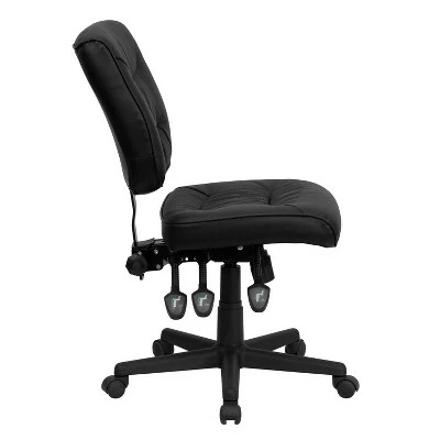 This multi-functional office chair will give you an edge on comfort with its design and adjusting capabilities. This chair features a comfortably padded seat and back with built-in lumbar support for long hour work days. A mid-back office chair offers support to the mid-to-upper back region. This chair is ideal for anyone who does a great deal of typing throughout the day and needs good back support. The locking back angle adjustment lever changes the angle of your torso to reduce disc pressure. The locking synchro tilt control allows the chair’s back and seat to recline at different rates, increasing the angle between your torso and thighs. The waterfall front seat edge removes pressure from the lower legs and improves circulation. Chair easily swivels 360 degrees to get the maximum use of your workspace without strain. The pneumatic adjustment lever will allow you to easily adjust the seat to your desired height.