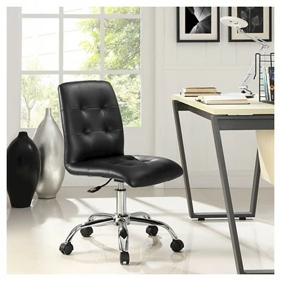 Etiquette presides over the properly styled Prim armless office chair. Modern to the touch, luxurious to the eye, Prim features deep tufted buttons, skilled faux leather upholstery, and elegant trim for added finesse. Prim is height adjustable, swivels to a 36 spin, and comes outfitted with a polished chrome steel base with five dual-wheel nylon casters. Perfect for conference rooms, workstations, or desks, Prim is a modern piece that works admirably to further the finer civilities of life.