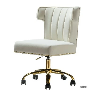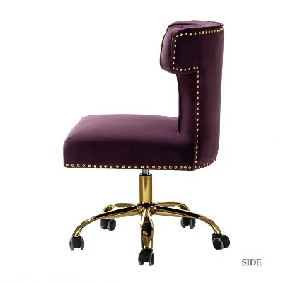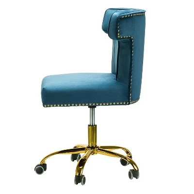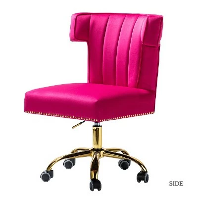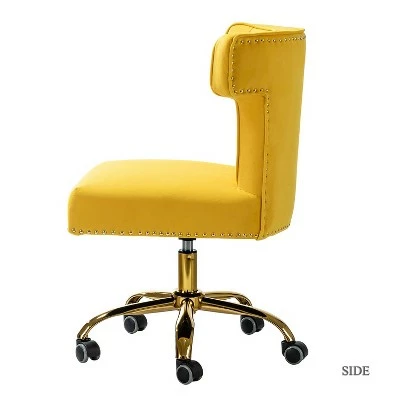 A well-edited workspace calls for a carefully-curated chair – and this design is it! It offers supreme comfort thanks to its ergonomic shape and features a durable frame with soft filling. The bright and colorful finish will blend with most color palettes. Its classic design along with wingback and gleaming nailhead trim makes this chair a must-have in your home office. Durable gold finish metal five-pronged base and high performance all directional wheels allow smooth movement across carpeting. This chic design is height-adjustable to personally tailor your space.