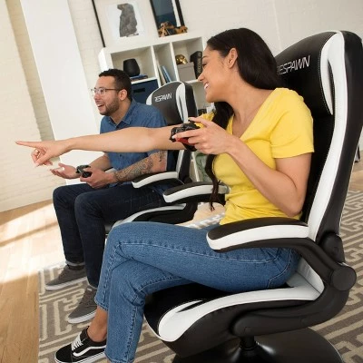 We see you, console gamer, we know your needs are different than your PC gaming brethren. This gaming rocker was built with you in mind, letting you get lower and closer to the action than our other RESPAWN chairs. The RESPAWN-800 Racing Style Gaming Rocker Chair, Rocking Gaming Chair, in Black, graduates you from those old-school floor model rockers by lifting you up to the right height while retaining your ability to rock back. Comfort features include padded, pivoting armrests that flip up out of the way when needed, a high back with segmented padding and extra head and neck cushioning, and a robust built-in lumbar support for those long hours in front of the TV. This rocking gaming chair was designed to support you through casual to extreme gaming sessions and the stain resistant bonded leather and PVC materials cover the gaming rocker for long-wearing, extended use. The chair sits on a trumpet pedestal base that provides sturdy support, swivels 360 degrees to make movement easy, and features a tilt tension adjustment that controls how easily the chair rocks back. The chair measures 29.13″ D x 25.98″ W x 41.73″ H, and holds users up to 275 lb. An award-nominated brand, RESPAWN is committed to your satisfaction and covers this desk with our RESPAWN Limited Warranty. Get off the floor and level up, literally!