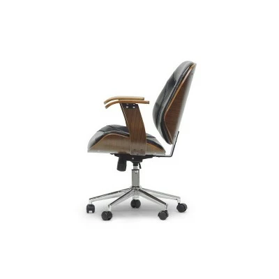 Getting down to business is a dewith the tailored look of our Rathburn Designer Office Chair. Made in China with a contemporary blend of walnut effect plywood and faux leather, the Rathburn Chair features a paneled seat and foam cushioning for optimum comfort. Also included are the oft-desired 360 degree swivel and height adjustment features you have come to expect in a task chair. Finishing off this modern office chair is a chrome-plated steel base with plastic caster wheels. The Rathburn Office Chair requires assembly and should be wiped clean with a damp cloth. 24.37″W x 26″D x 36″H, seat dimension: 19.62″W x 18″D x 19.12-21.75″H, arm height: 27.62″ 24.37″W x 26″D x 36″H, seat dimension: 19.62″W x 18″D x 19.12-21.75″H, arm height: 27.62″