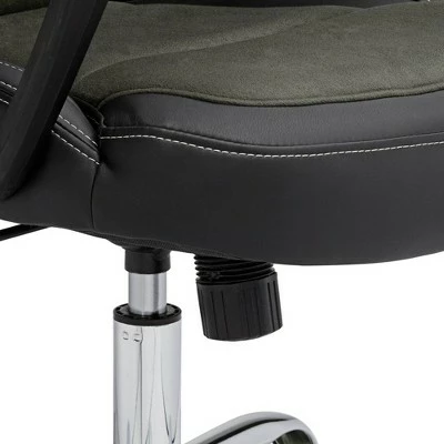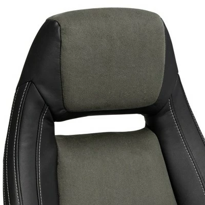 - Faux gray suede and black leather upholstery. White stitch detailing. Cushioned arms.