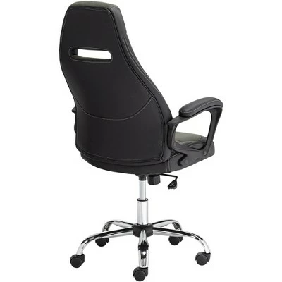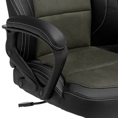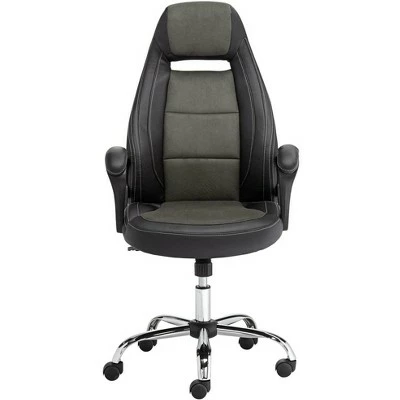 This height-adjustable black and gray office chair features a plush seat with cushioned arms for ultimate comfort. The seat offers a full swivel, and the high back provides full support. This office chair adds a professional look wherever you put it.