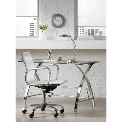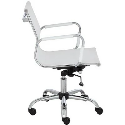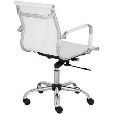 Chic, modern design and features make this adjustable white and chrome desk chair a highlight of any office decor. The white mesh seat and back is made of durable polyurethane mesh while the frame and armrests feature glistening chrome finish. A tilt mechanism and gas lift seat height control let you adjust the chair to fit your body. Nylon caster wheels and low back.