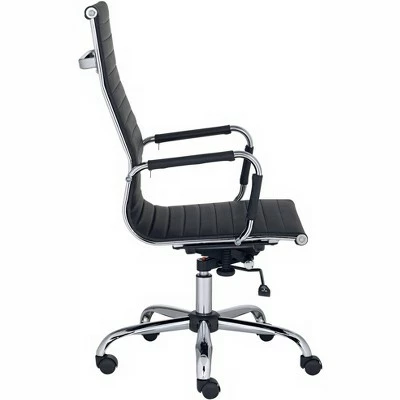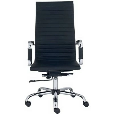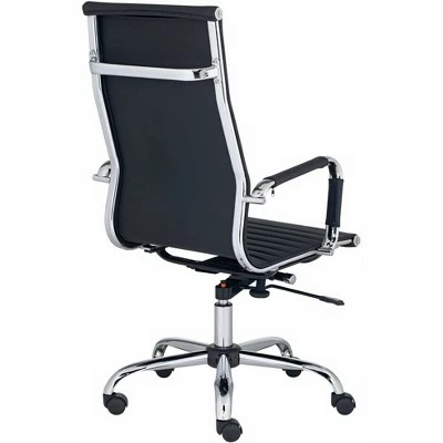 This contemporary office chair from the Serge collection combines smooth, modern lines with rich black faux leather upholstery. The frame is brilliant chrome plated steel. This ultra-functional chair offers a rolling, swivel base and a tilt mechanism. Great for the home office.