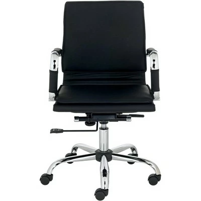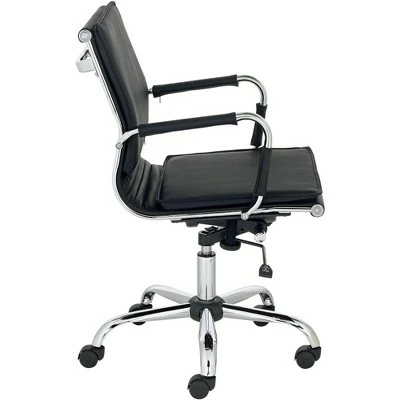 This sleek office chair is adjustable and moves with ease. The chrome frame is matched with gorgeous black faux leather, so it always looks great. The padded seat and back feel great on your spine and the tilt is adjustable. Enhance your productivity by enhancing comfort!