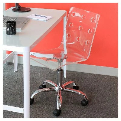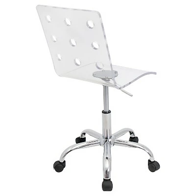 The Swiss Office Chair is aptly named after Swiss cheese because of the unique 9 hole pattern in the backrest. Made from clear acrylic, this office chair is as unique as it is comfortable. The Swiss Office Chair also features a chrome 5-star base with casters, adjustable height, and 360-degree swivel.
