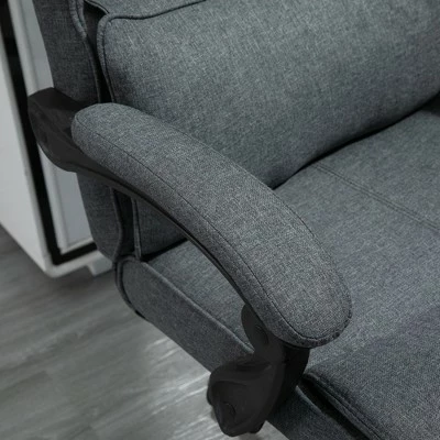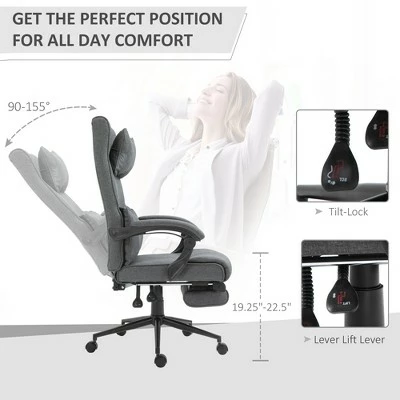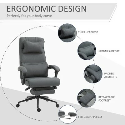 Kick comfort into high gear with this reclining office chair with extra headrest, armrest, lumbar pillow and retractable footrest from Vinsetto. With a 90-150 degree adjustable backrest, 360-degree swivel function, adjustable seat height, and a sturdy base with smooth rolling casters, this executive office chair can meet your different needs. Thanks to its high-quality materials and its ergonomic structure, the fabric office chair helps to maintain a correct and comfortable posture for those who must remain seated at the desk for several hours. This versatile ergonomic home office chair comes with a footrest that can be pulled outwards to relax your legs on or fully withdrawn for working, gaming, or studying.