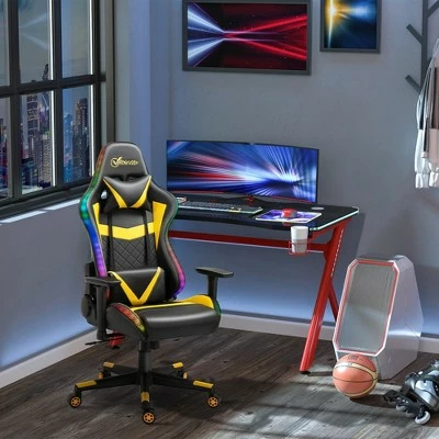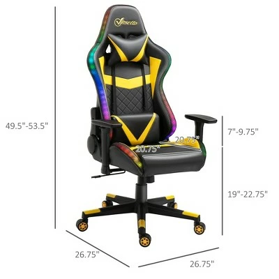 Enjoy long gaming sessions with your friends or raids with your guild but are having trouble staying comfortable? Looking for a high-end looking chair without paying high-end prices? Vinsetto comes in clutch with this high-back gaming chair. Enjoy the colorful LED’s on the sides of the high-end cushioned backrest. Use the remote control to adjust the color, brightness, light mode and speed. This office chair comes with a pillow headrest and lower lumbar pillow for neck and back support. When you’re ready for a break, adjustable seat height, adjustable armrests and reclining angle allow for further comfort. The 360 swivel wheels makes getting around your room easier. Don’t leave your gaming fun early from back pain again with this video game chair from Vinsetto.